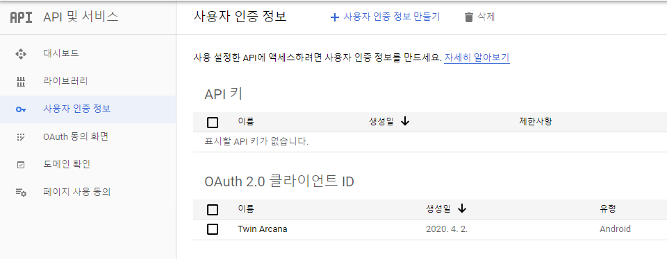 여기서 OAuth 2.0 ID 한개가 이미 생성되어있는 것을 확인 할 수 있다. 이 키는 출시용으로 사용되는 ID.