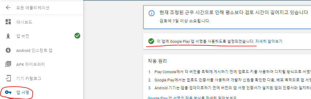 1. 어플리케이션 - 앱 서명 에서 최초 '구글 앱 서명을 사용'을 눌러줌. 한번 누르고 나면 위와같이