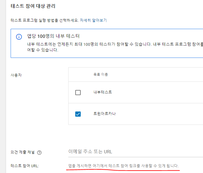 게시되었다면 테스트 참여 URL이 표시되기 시작하고, 이 링크로 설치가능하다.