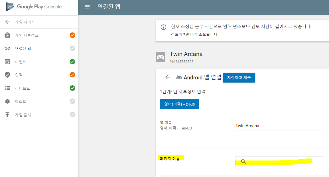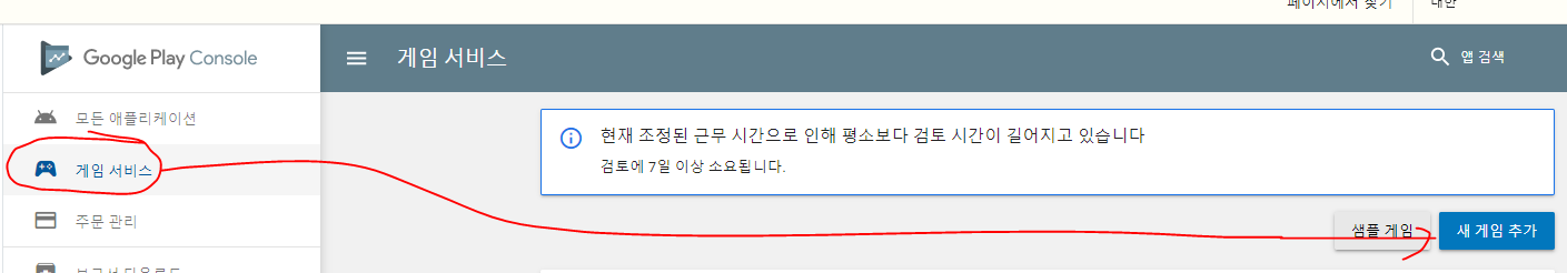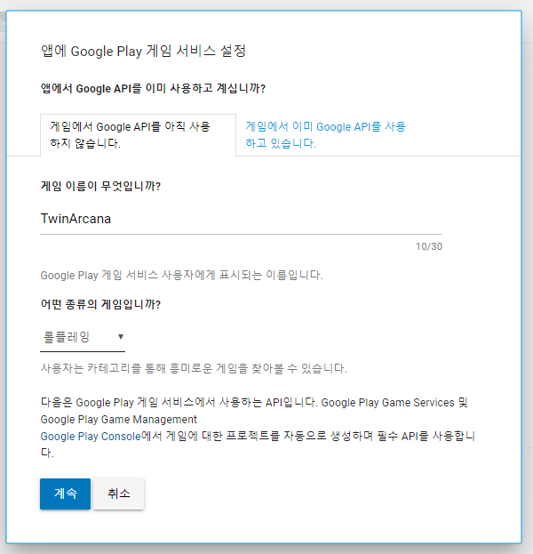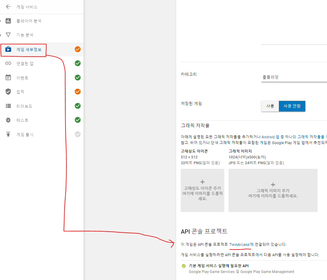 1.게임 서비스 - 게임 세부정보 - API 콘솔 프로젝트로 가서 ~에 연결되어있습니다 파란글씨 클릭