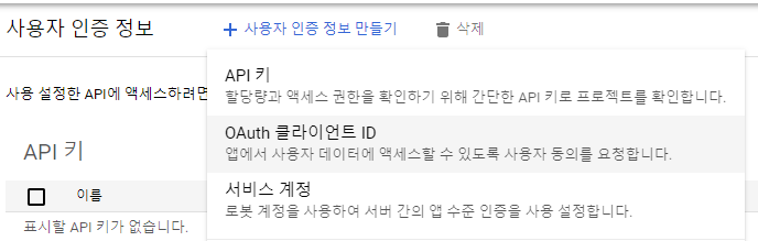 없으면 사용자 인증정보 만들기 -> OAuth 클라이언트 ID -> 웹 어플리케이션 으로 생성해서 클라이언트 ID를 받을 것.