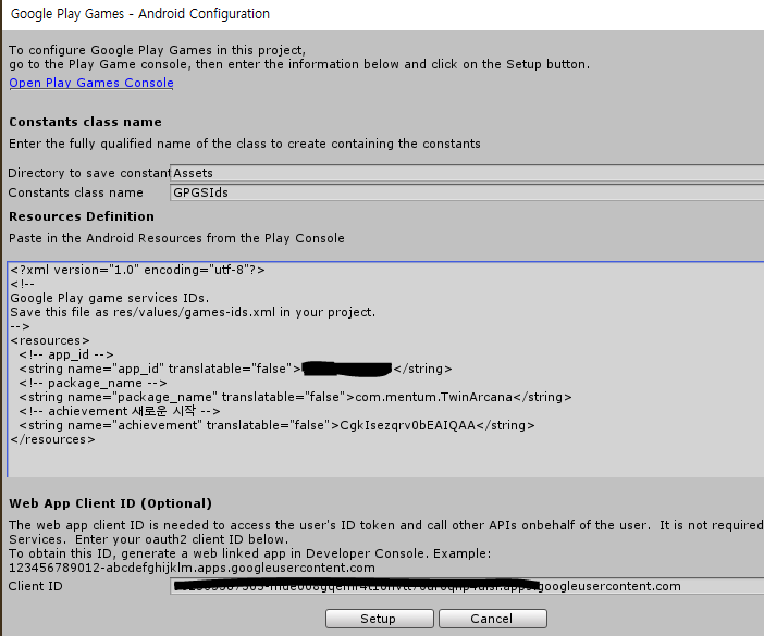입력 후 Setup을 누르면 GPGSIds 라는 클래스가 생기고,