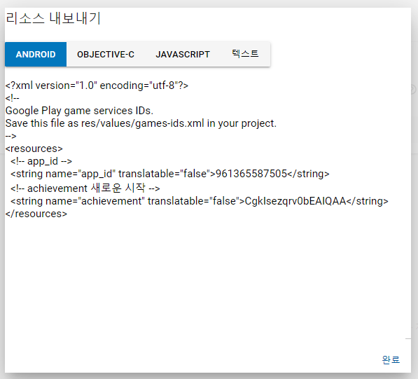 Resources Definition : 아까 위쪽에서 게임서비스 - 업적 - 리소스 받기에 적혀있던 텍스트를 붙여넣는다.