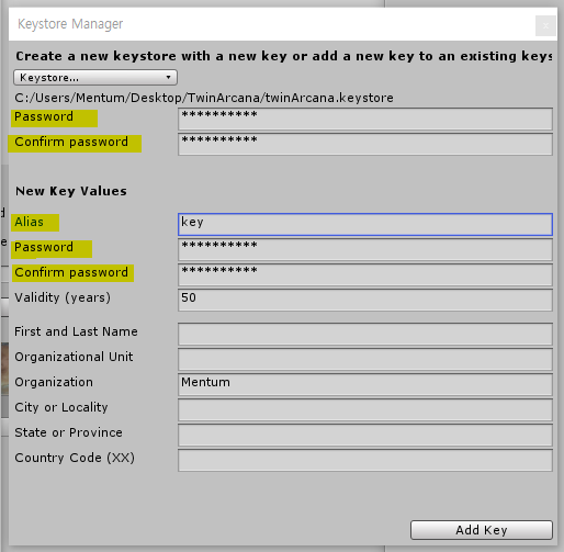 3. 표시된 부분 입력한 뒤, Add Key 눌러준다.