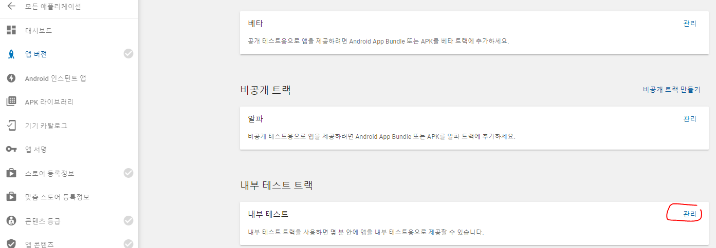 2. 앱버전 - 내부 테스트 트랙 - 관리