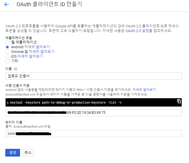 패키지이름 : (자신의 앱 패키지 이름 입력)