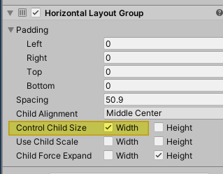 하위에 있던 fitter를 전부 삭제하고, Horizontal LayoutGroup에서 Control ChildSize의 Width를 체크하자.