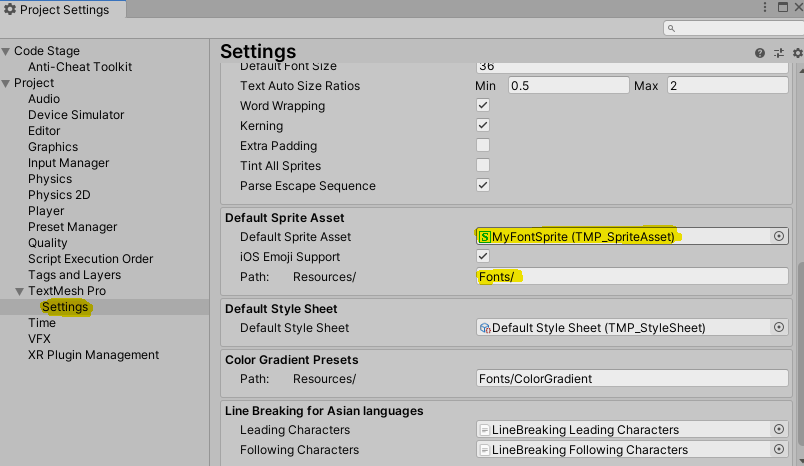ProjectSettings - TextMeshPro - Settings - Default Sprite Asset에 방금 생성한 SpriteAsset을 설정하자.