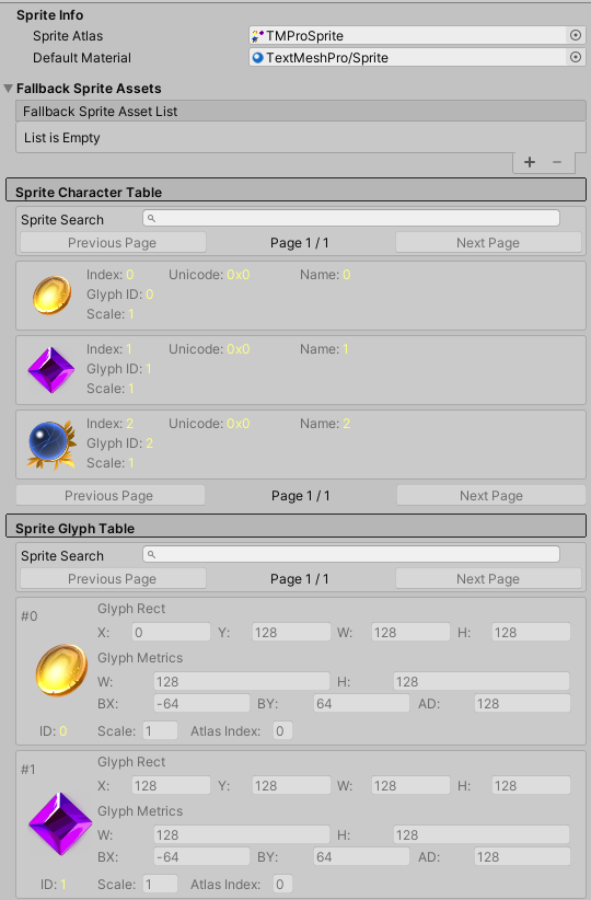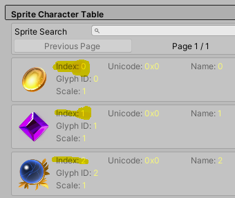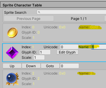 Sprite Glyph Table의 수치를 조정하면 표시되는 위치나 크기 등을 조절 가능하다.