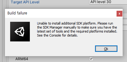 'unity unable to install additional sdk platform'가 출력되는 현상이 있음.