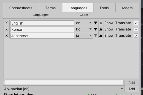 - I2Languages.asset의 Languages 탭에서 원하는 언어를 추가한다.