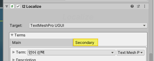 - 컴포넌트를 추가할때 Main에는 텍스트를 입력해주고, Secondary에는 Font(혹은 TMPRO Asset)를 설정하면 언어가 바뀔때 폰트또한 바꿀 수 있다.