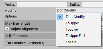 - 이를 위해 I2 Localize 컴포넌트의 Modifier 옵션을 설정하면 라벨의 표기를 변경가능. (tower -> Tower / TOWER 등)