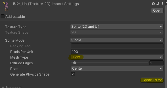 그런 뒤 오른쪽 아래의 Sprite Editor 버튼을 눌러 열린 창에서