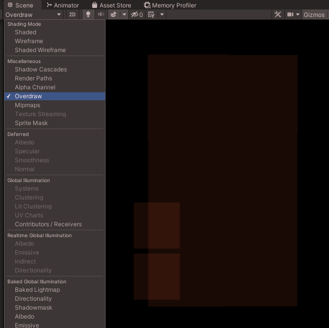 유니티의 Overdraw 디버깅툴을 통해 화면에 실제 그리고 있는 부분을 확인해 볼 수 있다.