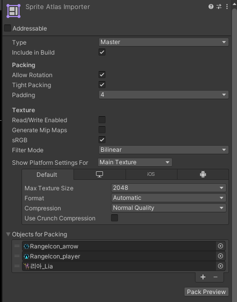 - ETC와 PVRTC 텍스쳐는 이미지의 사이즈가 2의 승수일 때만 압축이 가능하다. 2의 승수가 아니면 압축을 하지 못해 무압축 이미지가 되어버린다. 때문에 POT 사이즈의 틀 안에 작은 이미지들을 담아서 압축을 하는 것.