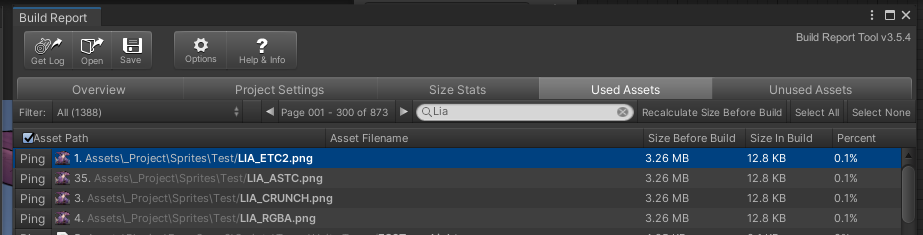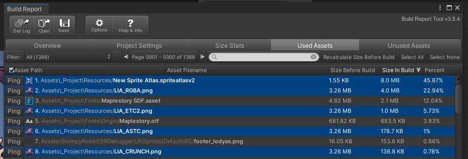 빌드 리포트에서 본 스프라이트의 용량. 원본 스프라이트의 용량은 138KB ~ 4MB까지 다양하지만 모두 12.8KB로 통일되었다.
