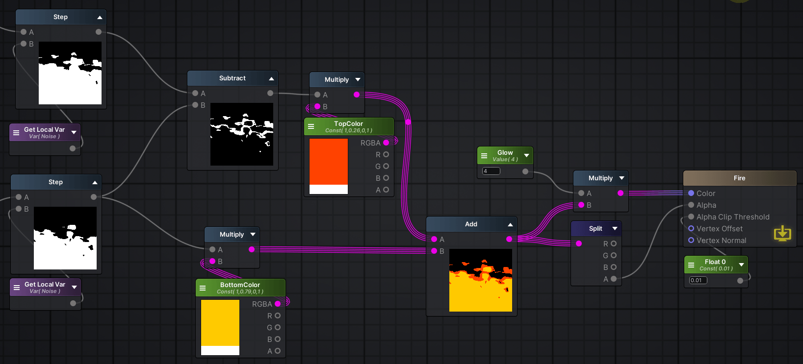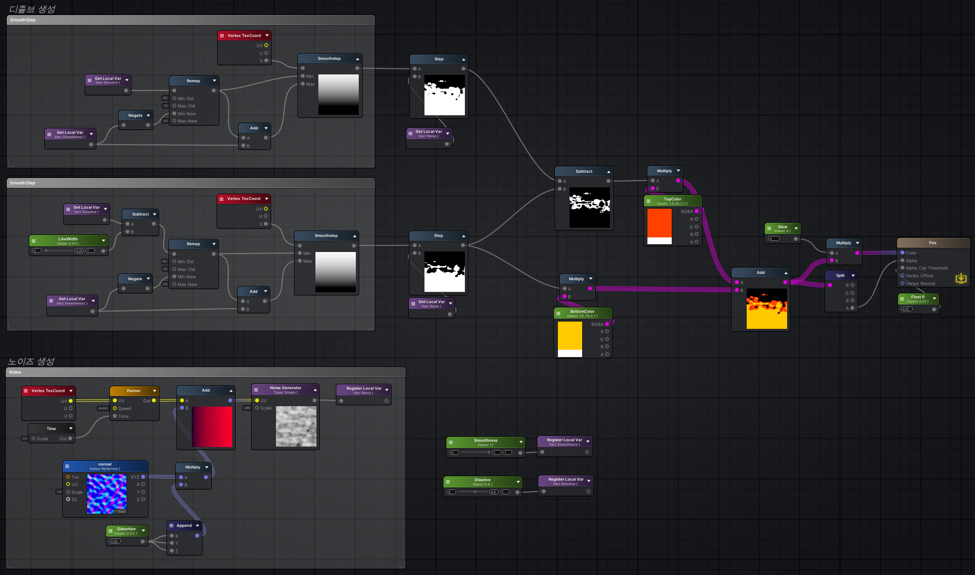 Noise Generator의 모양과 노멀맵 모양에 따라서 여러 불꽃모양이 나올 수 있으니 여러개를 넣어가면서 테스트하면 좋다.