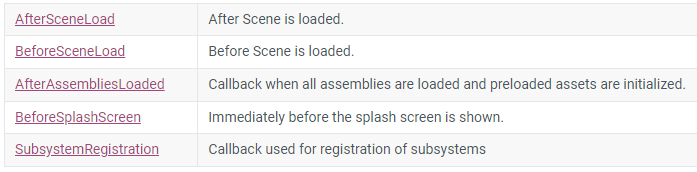 Unity Documentation : RuntimeInitializeOnLoadMethodAttribute