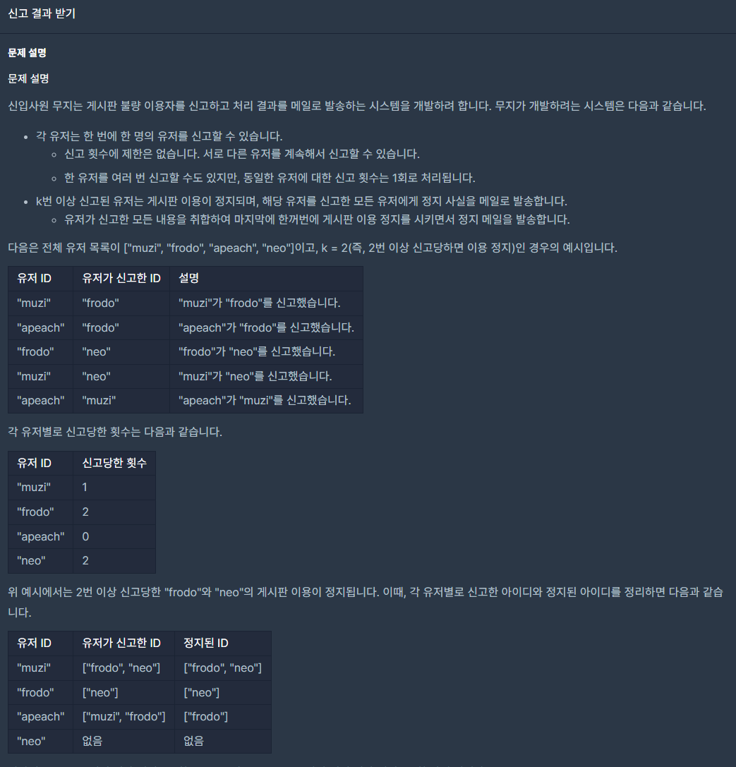 public int[] solution(string[] id_list, string[] report, int k) {