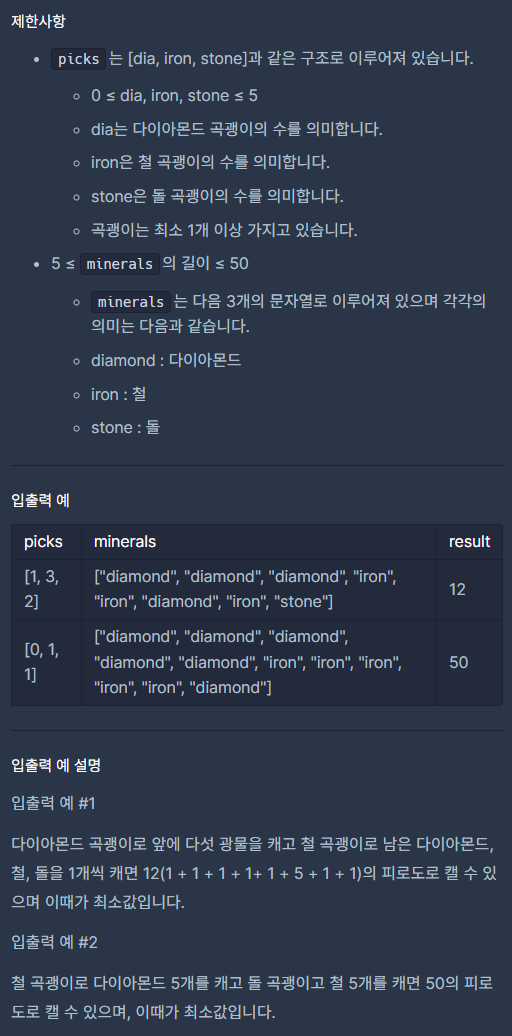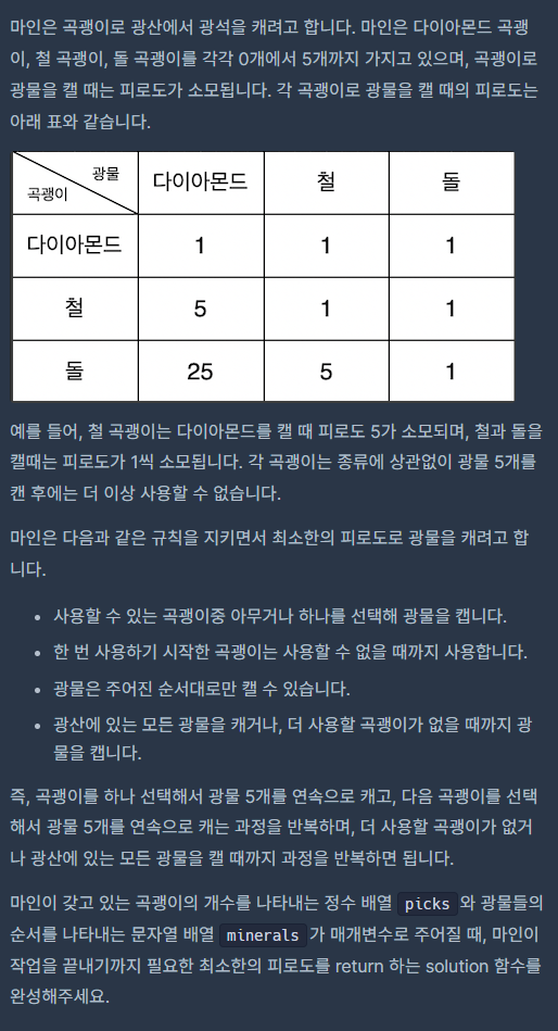 만약 곡괭이 수가 더 많은 문제라면 5개씩 묶어서 정렬하면 될 것이다.