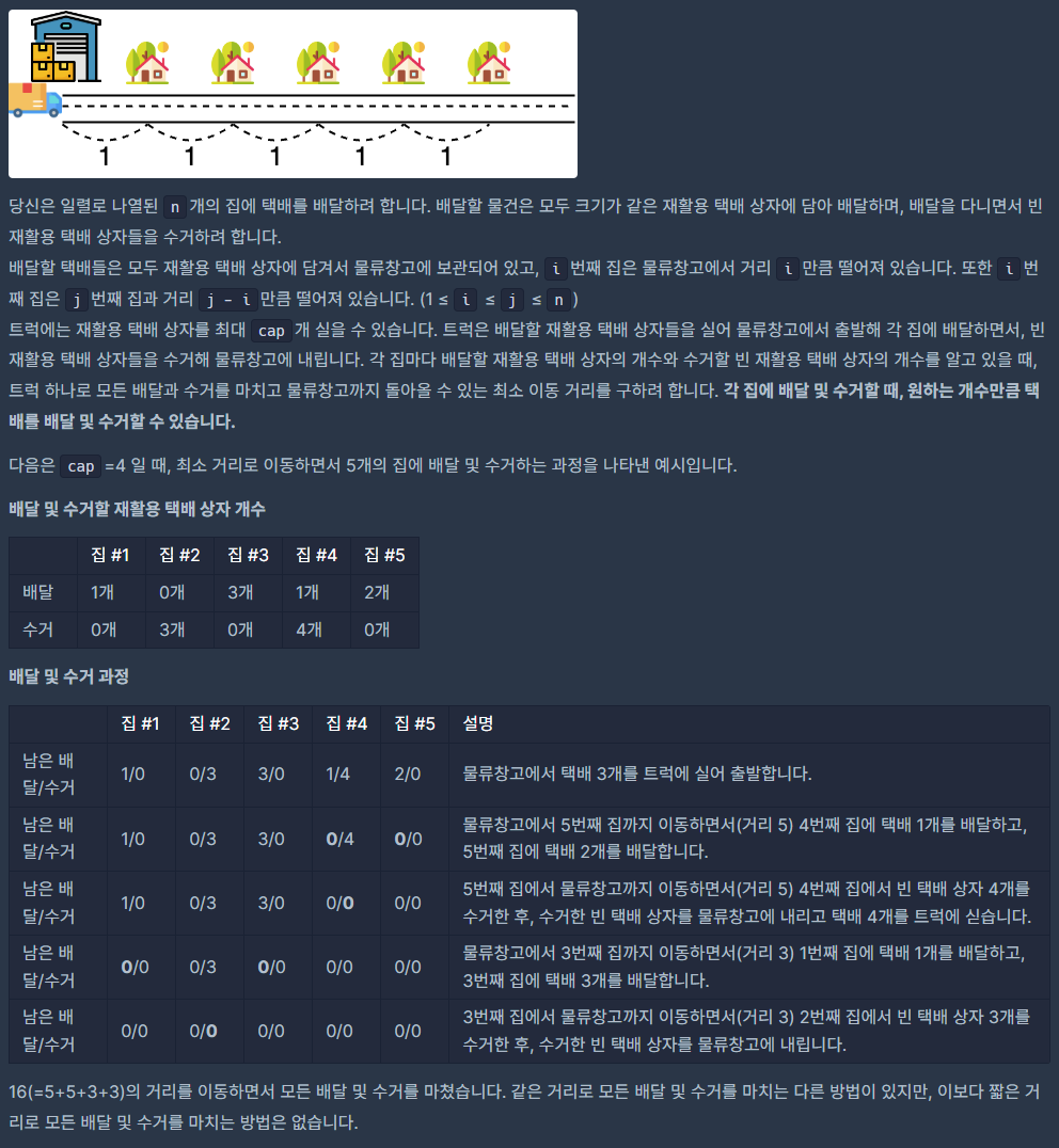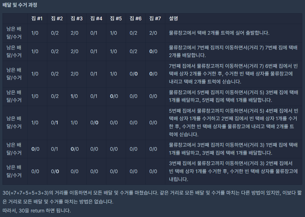 2. 배달해야 되는 곳보다 수거해야하는 곳이 더 멀 수도 있다. 이 경우 두 곳 중 더 먼 곳으로 갔다가 돌아오면 된다. (그리디)