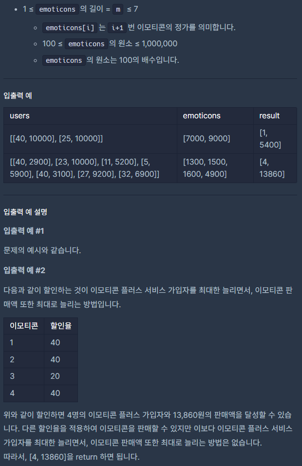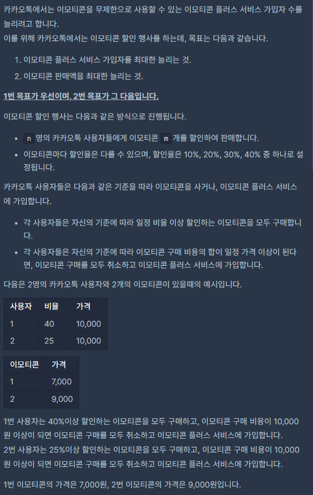 할인 폭은 10%, 20%, 30%, 40%로 고정이고 유저는 ~100명, 이모티콘 ~7개 의 조건으로