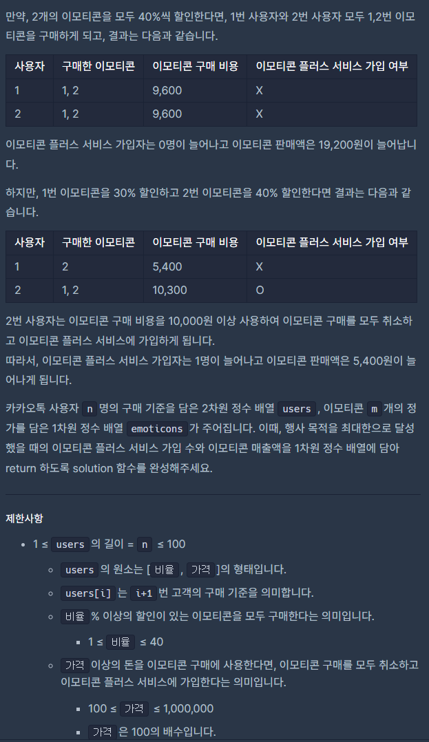 public int[] solution(int[,] users, int[] emoticons)