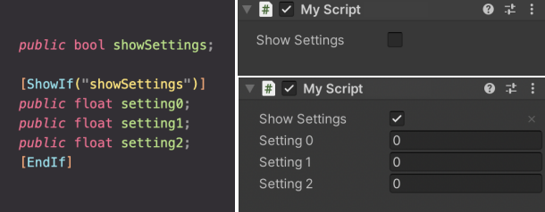 이외에도 Tab 그룹 / Variants / ShowIf, HideIf, EnableIf, DisableIf 그룹 등의 애트리뷰트를 제공한다.